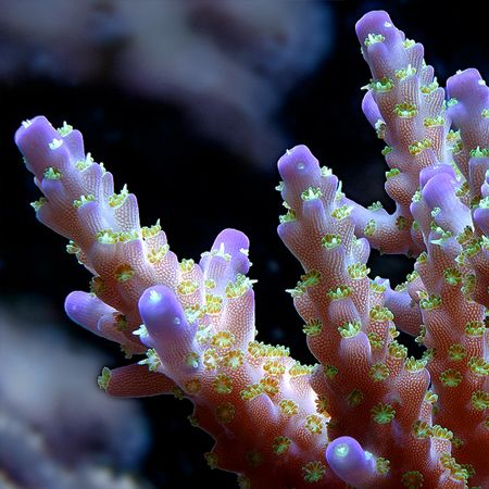 The Purple Tri-color Valida is a classic among the acropores. It has thin branches and well-spaced tubular corallites, the colony can reach a large size. This is one of the most easily adaptable species. It has a deep purple coloring on the tips that fades as we go down to the base and green polyps in a very noticeable way.