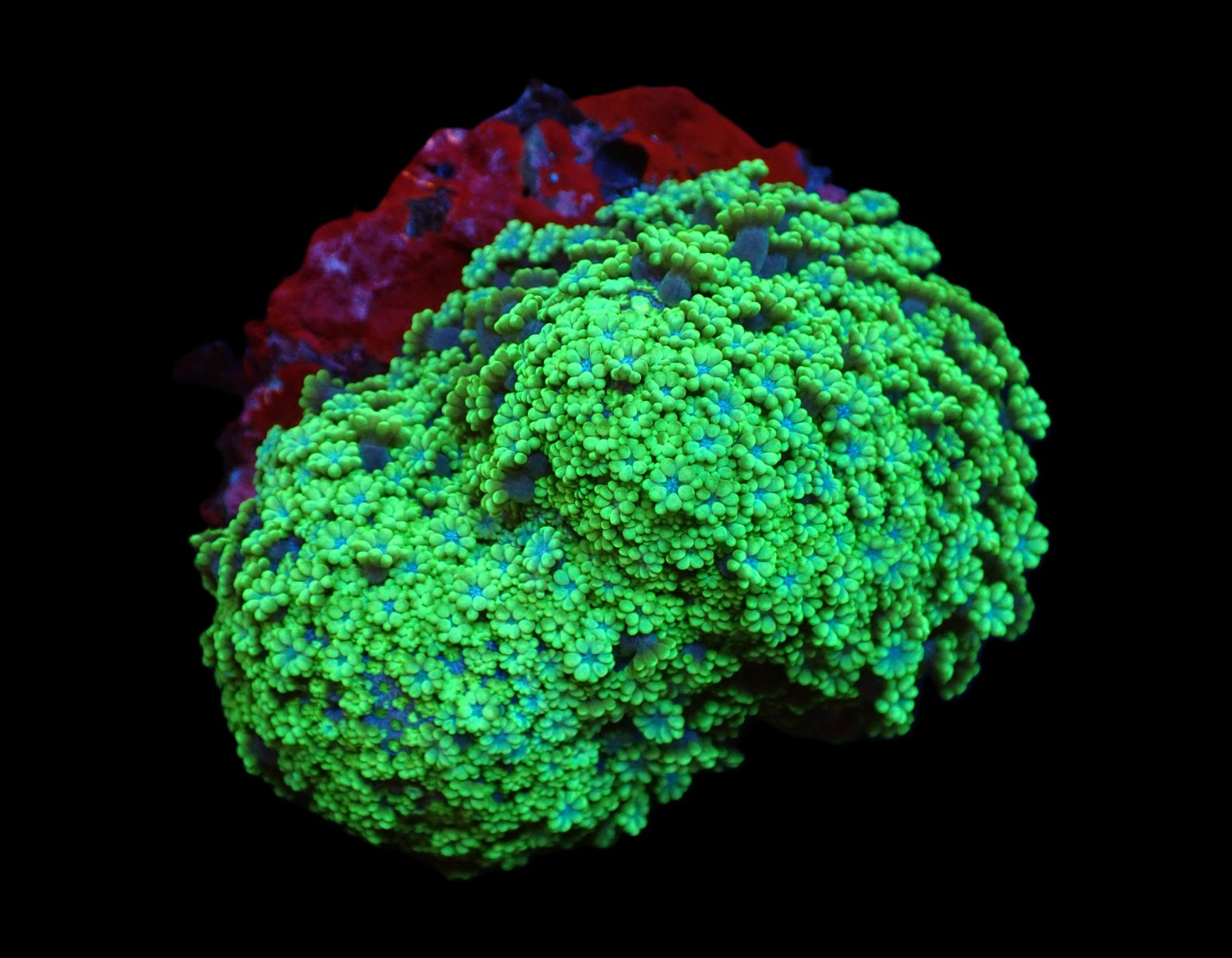 Alveopora spongiosa (Bright Green) is a beautiful LPS coral species that immediately stands out with its vibrant, bright green polyps and graceful movement in the current. This coral species forms spherical...
