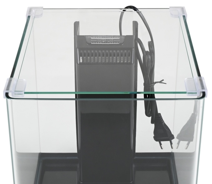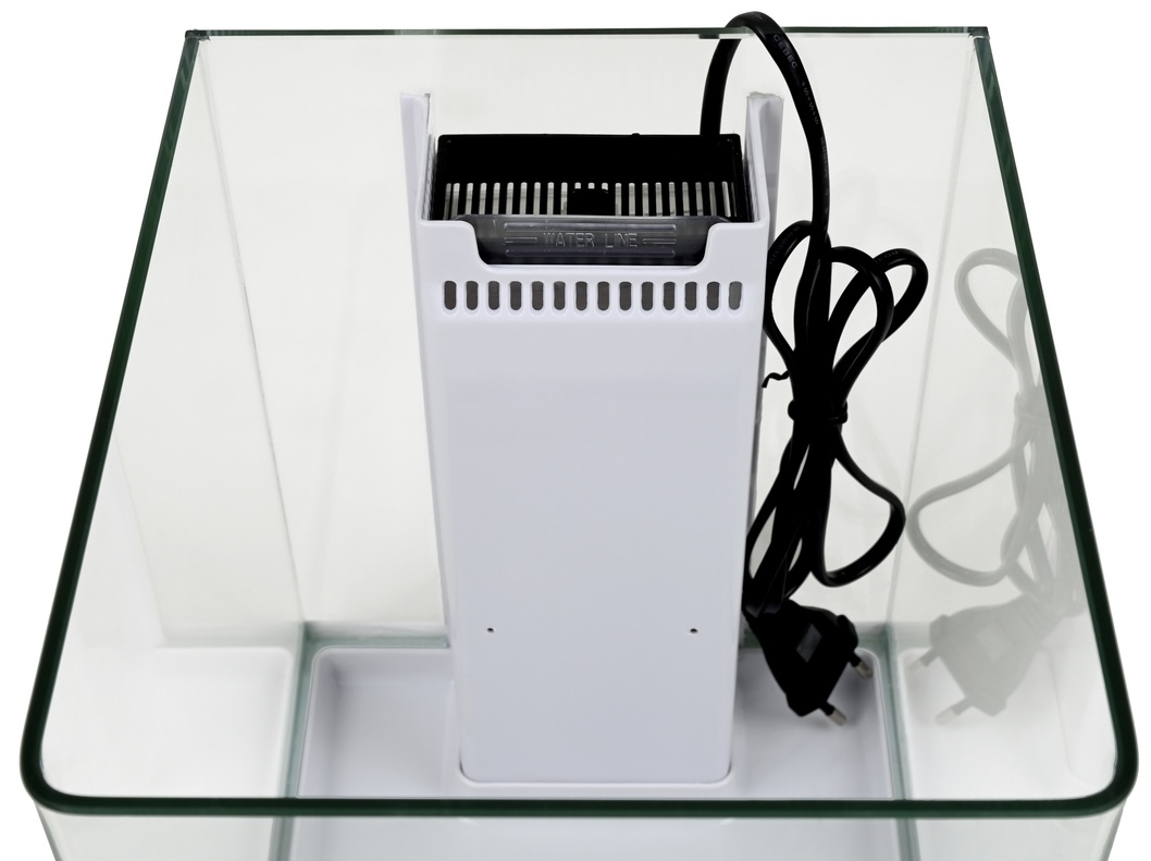 The aquarium features clear, seamless 4mm thick front glass, energy-efficient LED lighting with 21 LED diodes, and an internal filter system with a 3-layer media cartridge for effective mechanical and biological filtration.
