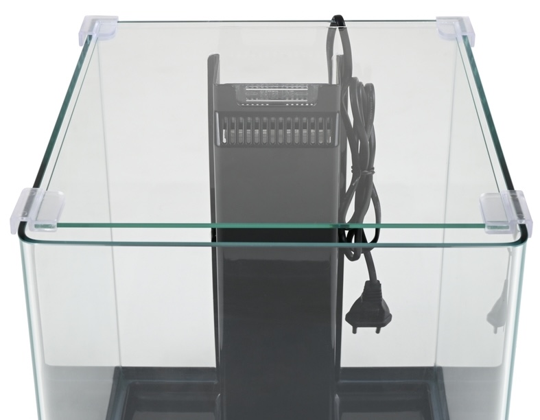The aquarium features clear 4mm thick front glass, energy-efficient LED lighting with 21 LED diodes, and an internal filter system with a 3-layer media cartridge for effective mechanical and biological filtration.