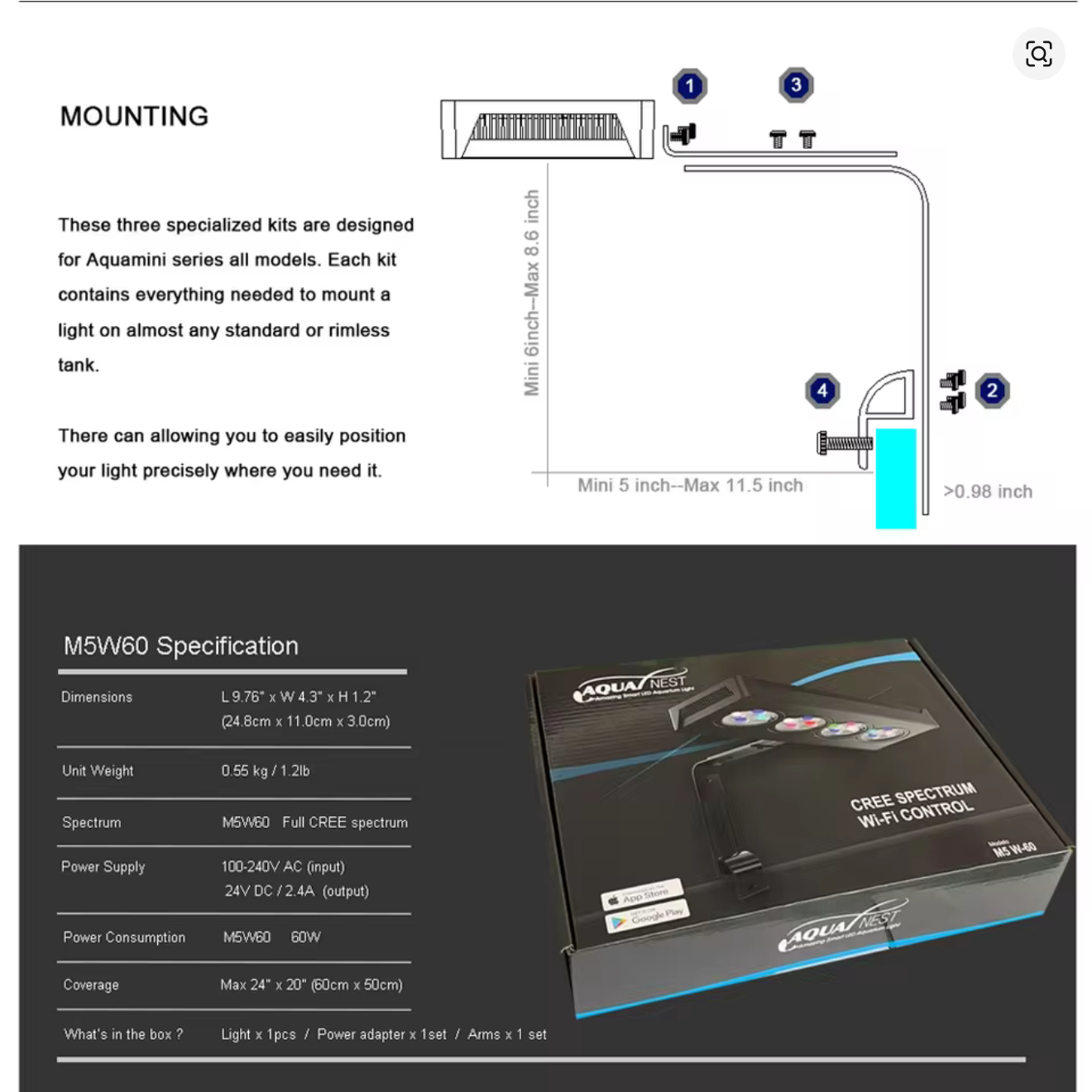 - Place the lamp above the aquarium with the supplied mounting