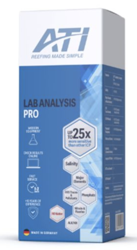 The ATI ICP Lab Analysis Pro is a comprehensive professional water analysis for marine aquariums. This analysis determines all the parameters of the Standard version and also includes nitrate, fluoride, and alkalinity (KH). Your reverse osmosis water is also analyzed using ICP-OES.
