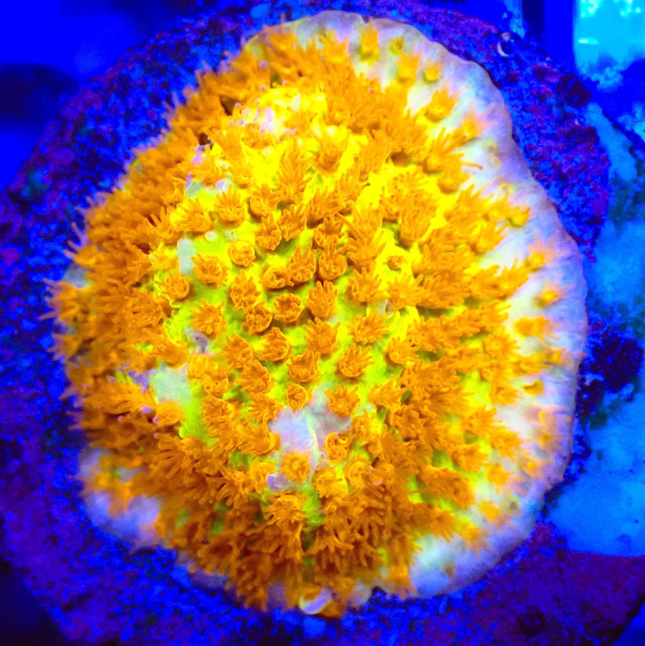 WYSIWYG1754993657079 Unique WYSIWYG Yellow Submarine Favia coral. One-of-a-kind, exactly what you see! Looking for a real eye-catcher for your reef tank? This unique WYSIWYG coral is an absolute must-have for every serious reefkeeper. No stock photos or surprises – what you see is exactly what you get. And what you get is spectacular.