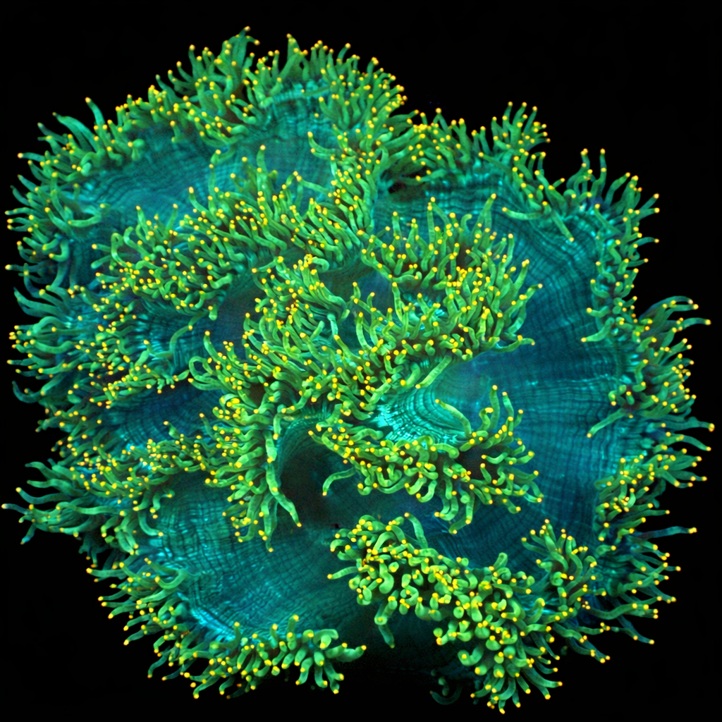 Unique WYSIWYG Catalaphyllia Jardinei Ultra Green Pink Tips coral. One-of-a-kind, exactly what you see! Are you looking for a real eye-catcher for your reef tank? This unique WYSIWYG coral is an absolute must-have for every serious reefkeeper. No stock photos or surprises – what you see is exactly what you get. And what you get is spectacular.