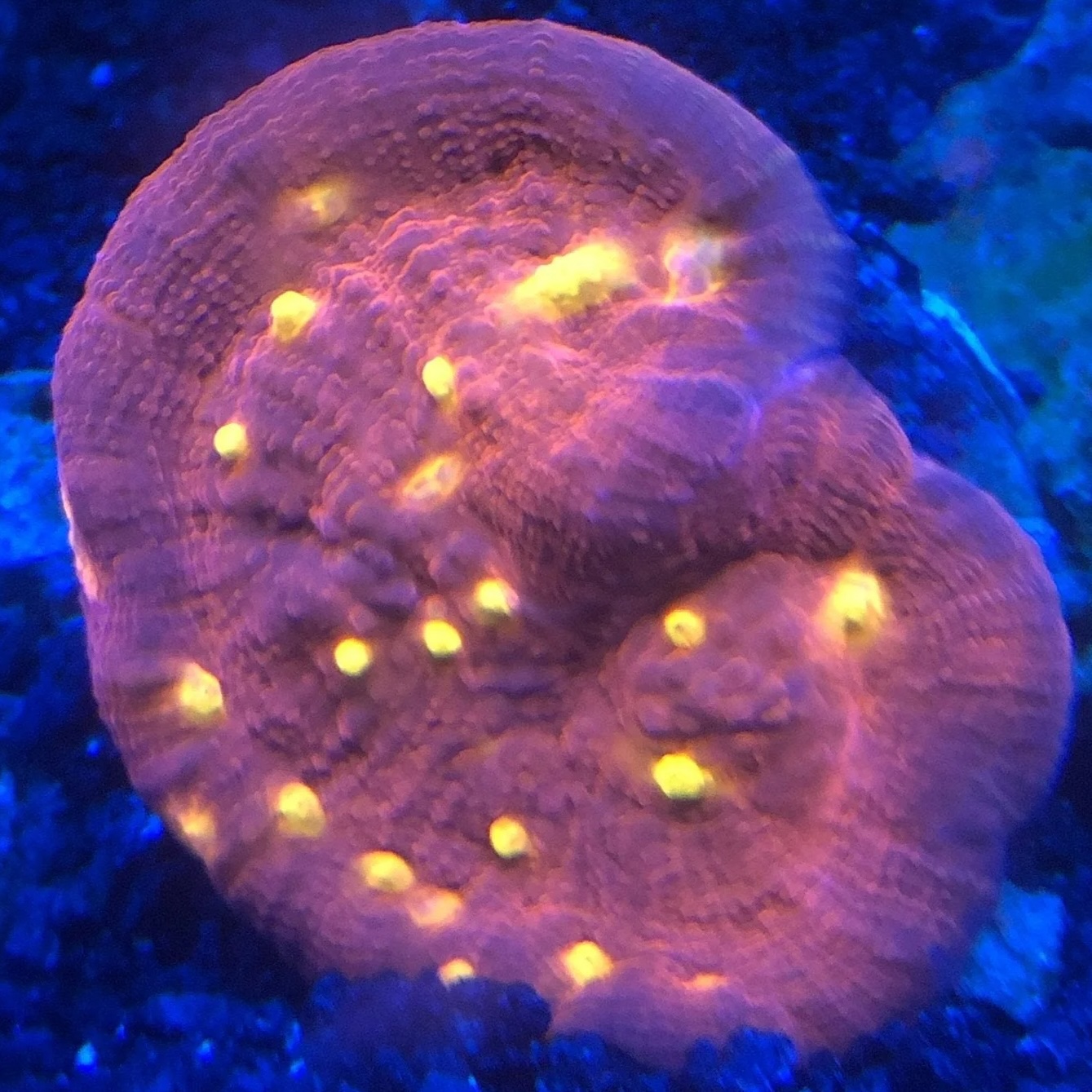 108196677 A Chalice is a plate-shaped coral with a clear color difference between polyps and the other flesh. This great contrast creates a beautiful drawing. This Ultra red with yellow dots is fe...