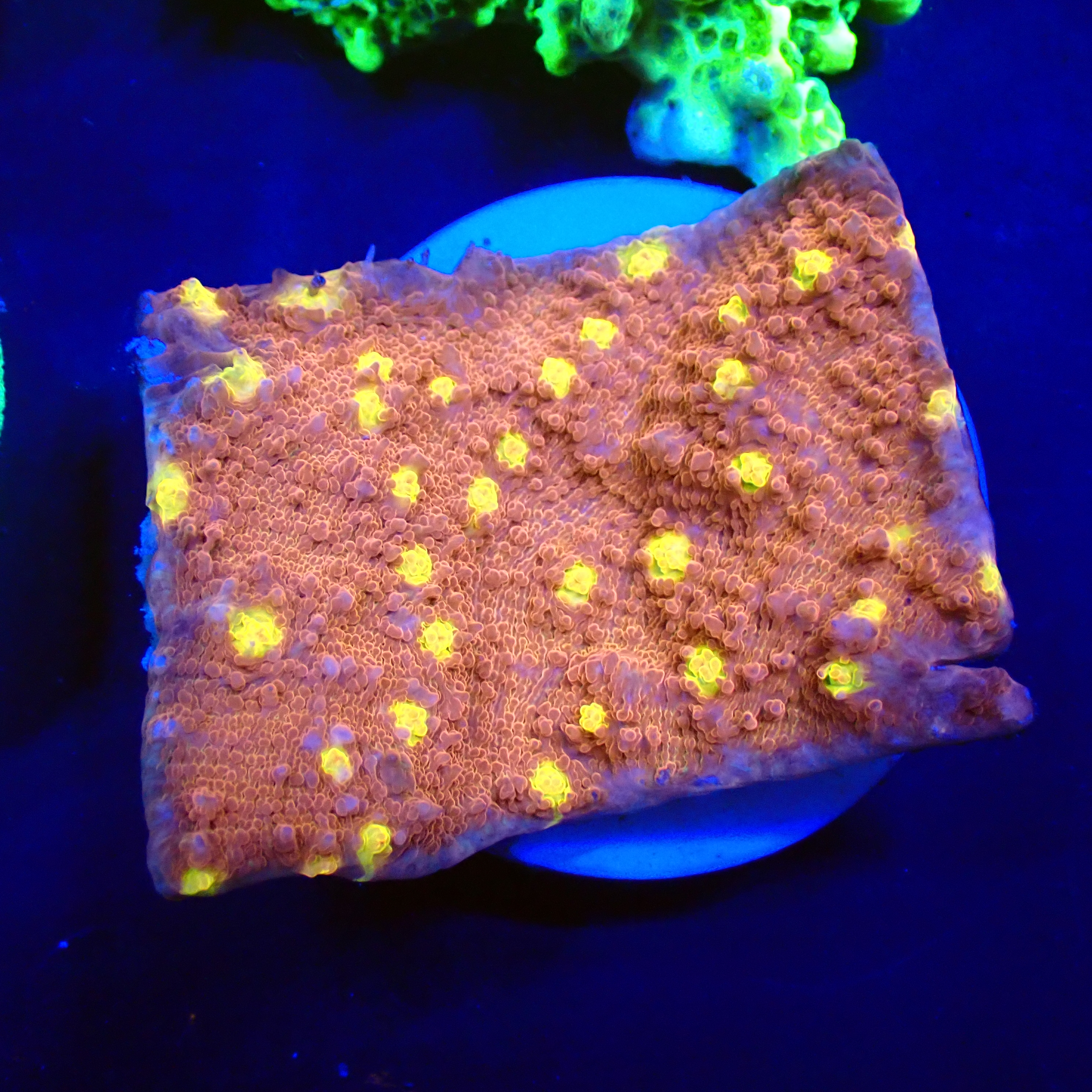 WYSIWYG1754993657079 Unique WYSIWYG Yellow Submarine Favia coral. One-of-a-kind, exactly what you see! Looking for a real eye-catcher for your reef tank? This unique WYSIWYG coral is an absolute must-have for every serious reefkeeper. No stock photos or surprises – what you see is exactly what you get. And what you get is spectacular.
