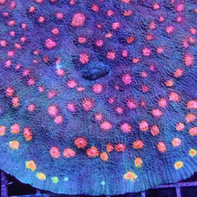 108196677 A Chalice is a plate-shaped coral with a clear color difference between polyps and the other flesh. This great contrast creates a beautiful drawing. This Ultra red with yellow dots is fe...