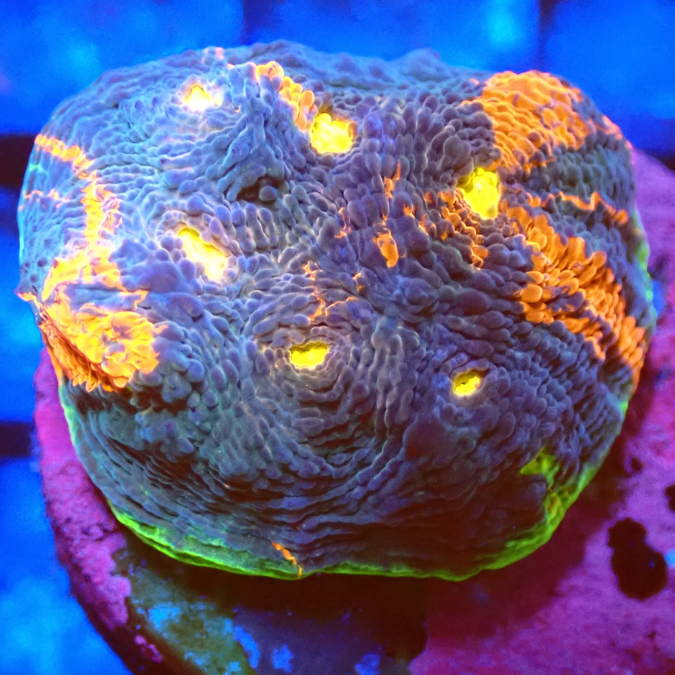 WYSIWYG1754993657079 Unique WYSIWYG Yellow Submarine Favia coral. One-of-a-kind, exactly what you see! Looking for a real eye-catcher for your reef tank? This unique WYSIWYG coral is an absolute must-have for every serious reefkeeper. No stock photos or surprises – what you see is exactly what you get. And what you get is spectacular.