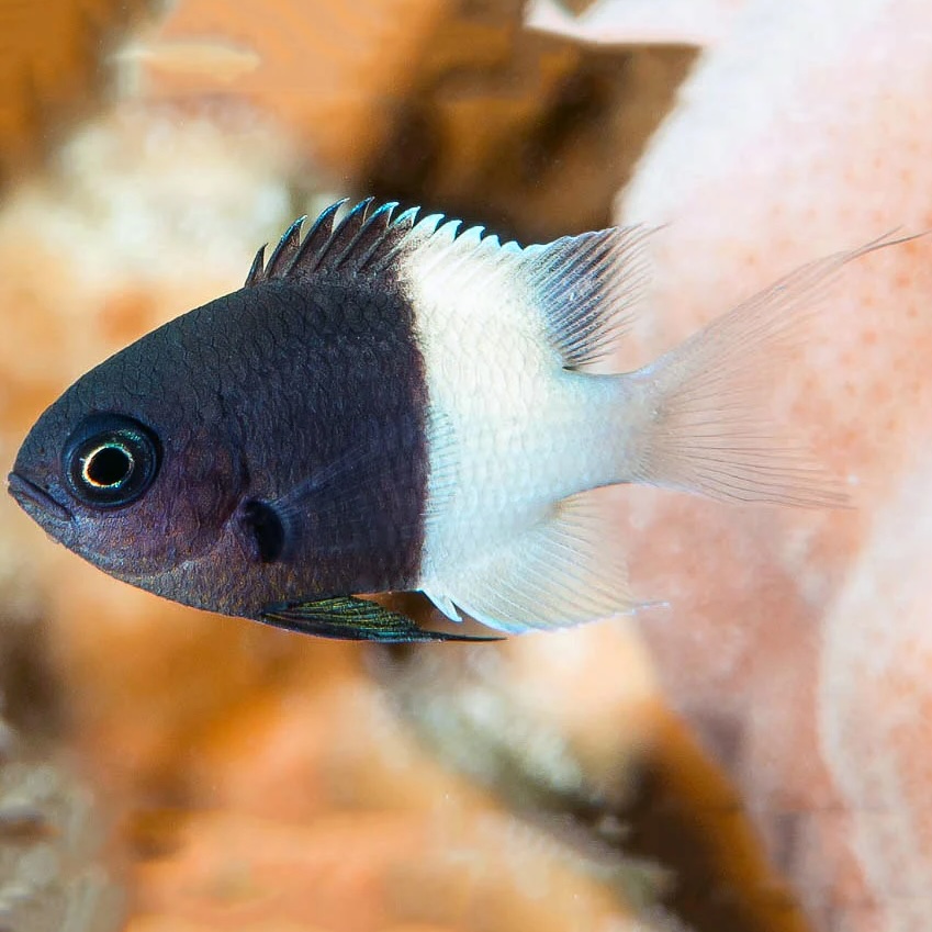Bring life and contrast to your marine aquarium with the Chromis margaritifer! This graceful fish, native to the tropical waters of the Indo-Pacific region, stands out with its deep black body and pearly white snout and forehead—a unique color pattern that earns it the nickname pearl damselfish.