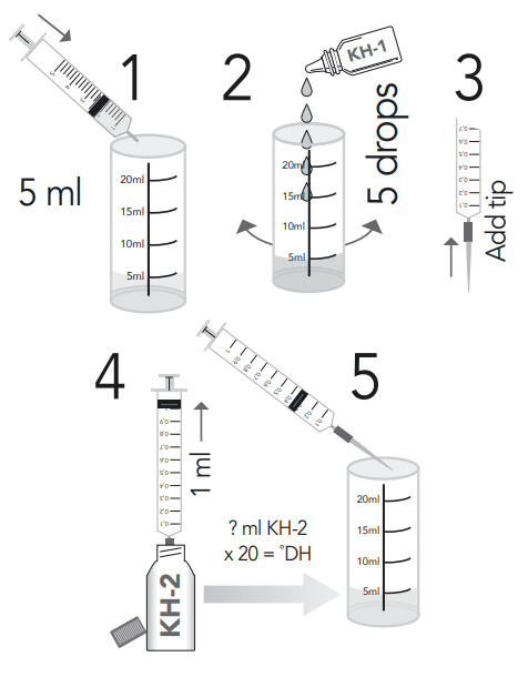 - Multiply the amount of KH-2 test solution used in milliliters by 20 to calculate the KH value in °dH, or use the table in the manual