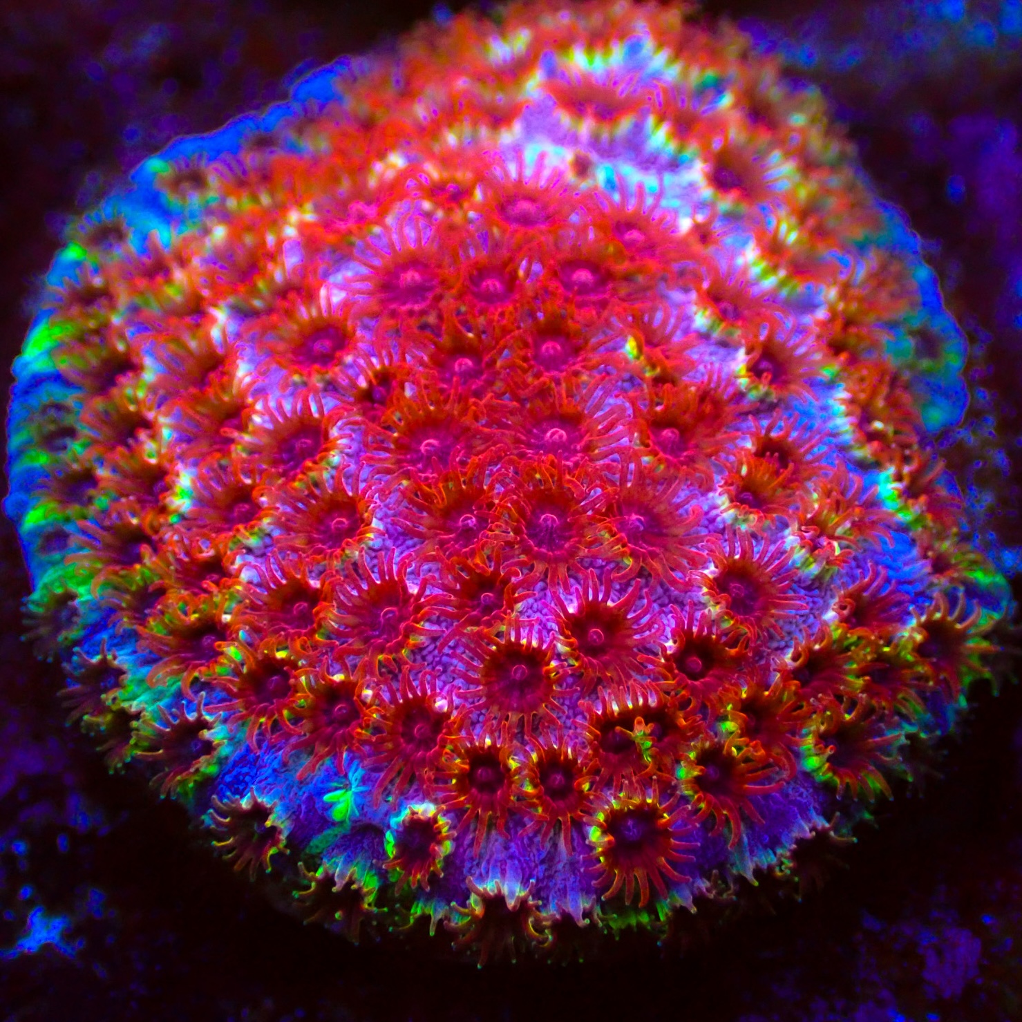 - Spectacular red polyp “pop” on a cool green base, maximised under blue light.