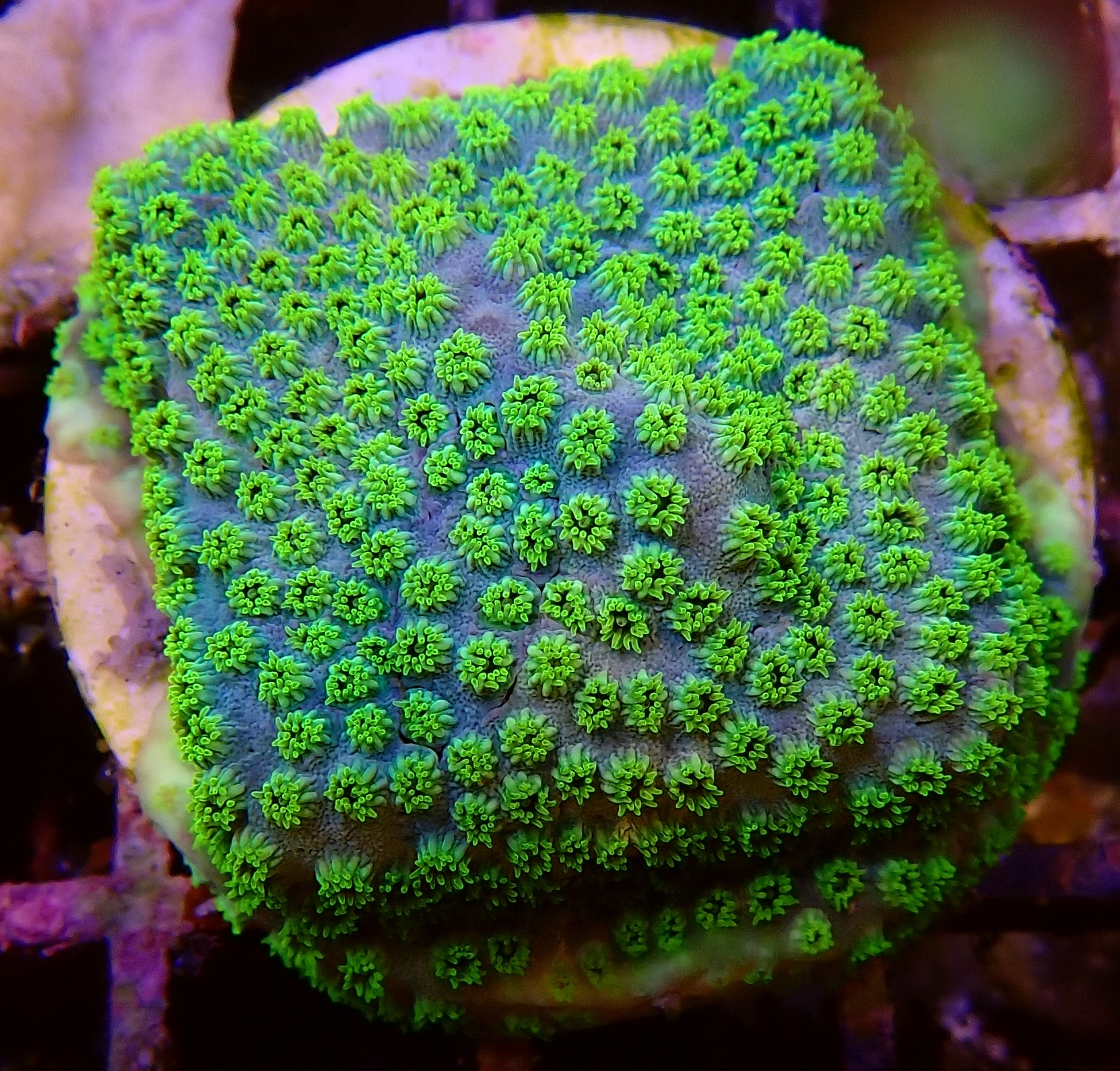 WYSIWYG1754993894011 Unique WYSIWYG Cyphastrea Green coral. One-of-a-kind, exactly what you see! Looking for a real eye-catcher for your reef tank? This unique WYSIWYG coral is an absolute must-have for every serious reefkeeper. No stock photos or surprises – what you see is exactly what you get. And what you get is spectacular.