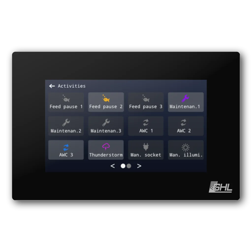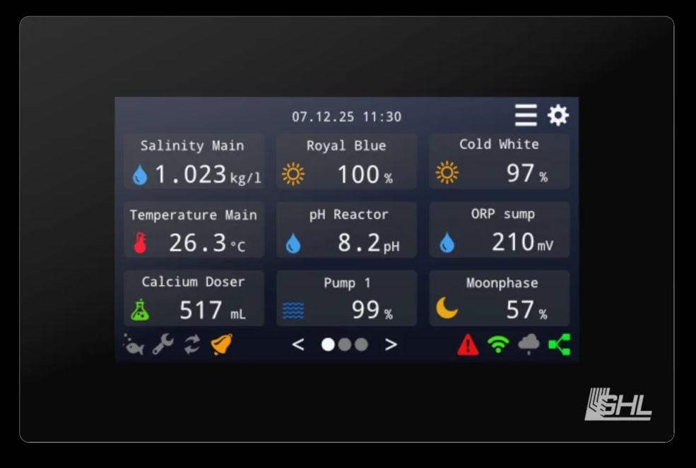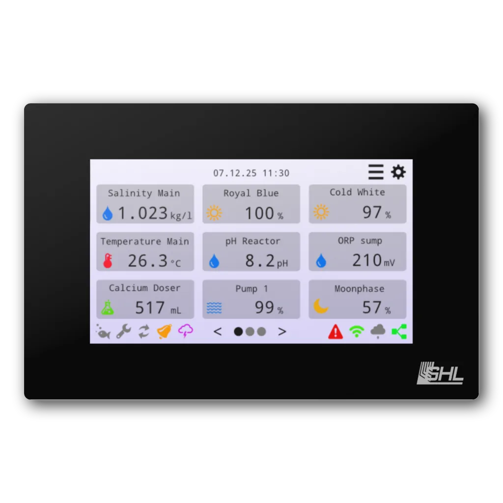 Thanks to the clear interface with customizable status fields, graphs, and direct control options, you always have quick access to measurements, lighting, and connected equipment. Features such as water change, maintenance mode, storm simulation, and light scenes can be activated directly from the screen.