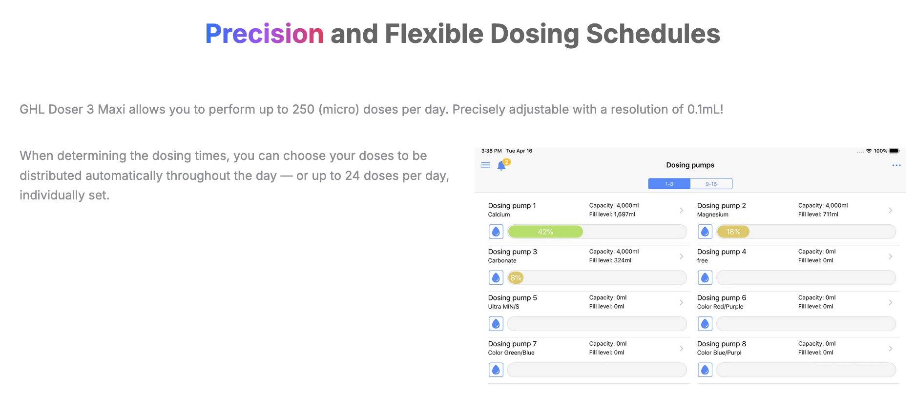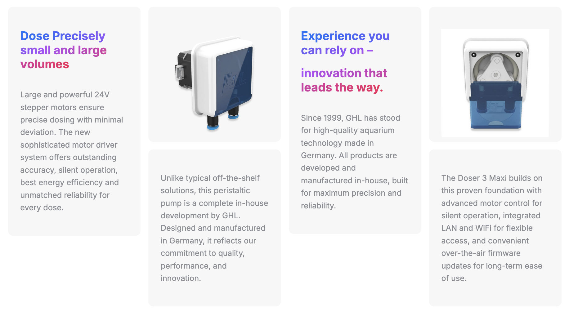 The GHL Doser 3 Maxi is GHL's powerful dosing pump, designed for applications where accuracy, reliability, and high flow rates are essential. Perfect for use in both marine and freshwater aquariums, this pump is ideal for automatic water changes, dosing larger volumes of liquids, or controlling calcium reactors and other systems.