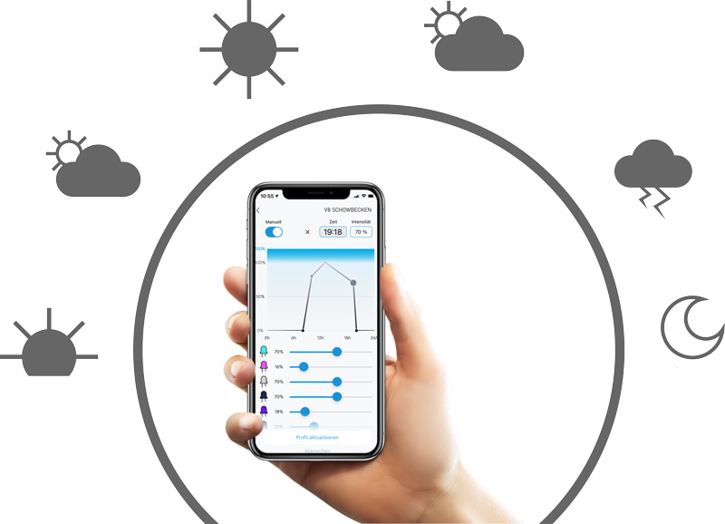 - Activate automatic sunrise, sunset and moon cycles for a natural rhythm in the aquarium.