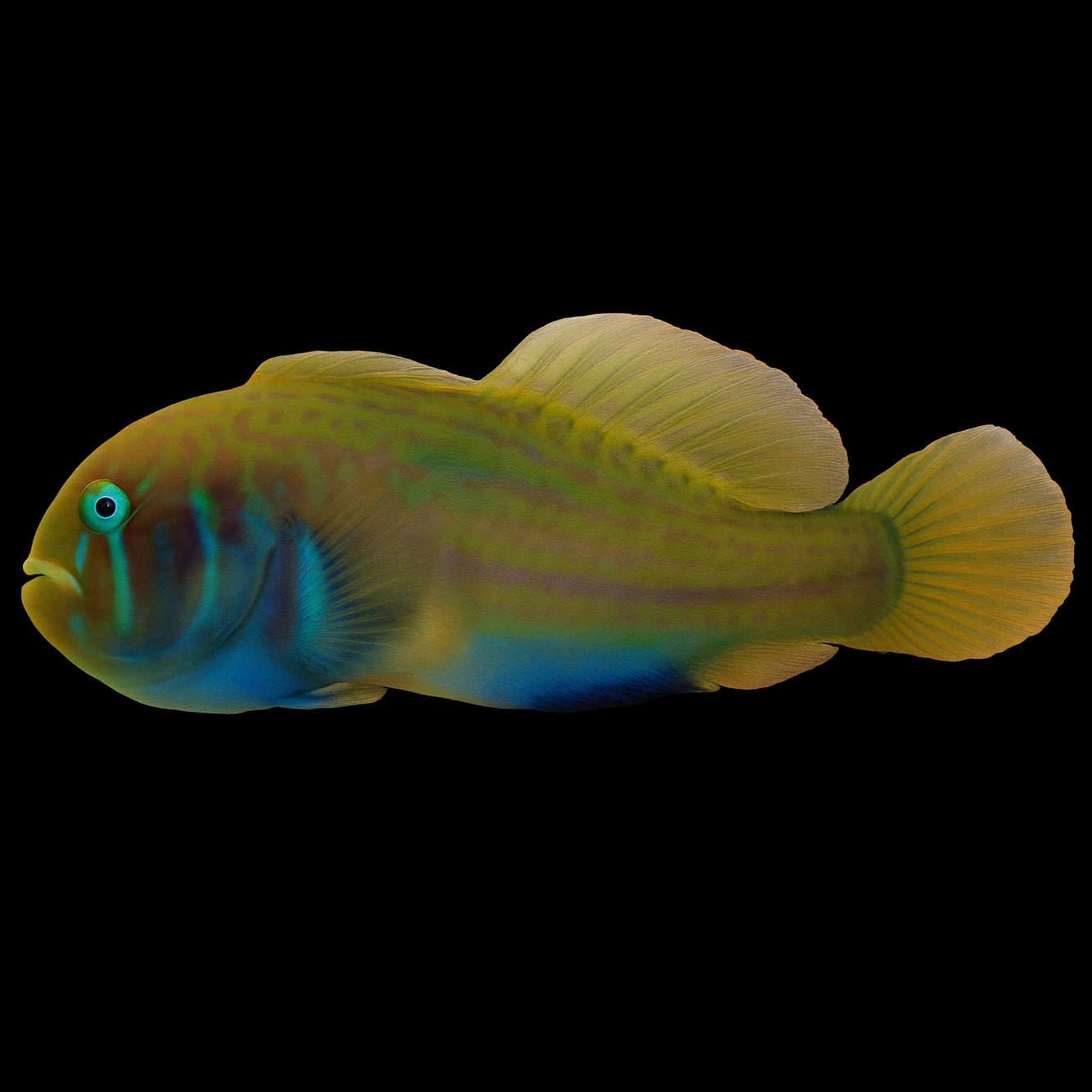 The Gobiodon histrio, better known as the Green Coral Goby, is a beautifully colored, small reef dweller with a unique character. This compact fish is immediately noticeable for its vibrant blue-green color pattern with turquoise stripes across its head and body.