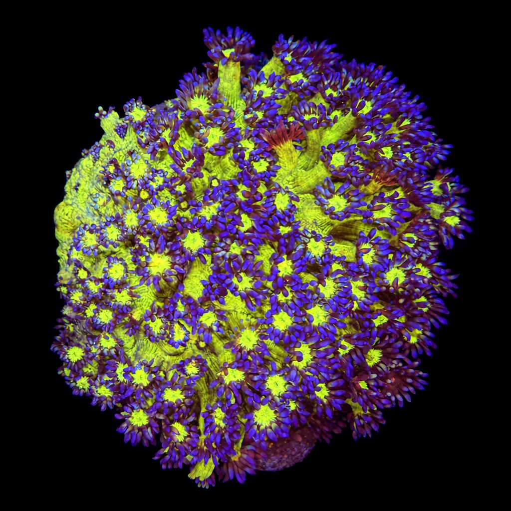 WYSIWYG1754993657079 Unique WYSIWYG Yellow Submarine Favia coral. One-of-a-kind, exactly what you see! Looking for a real eye-catcher for your reef tank? This unique WYSIWYG coral is an absolute must-have for every serious reefkeeper. No stock photos or surprises – what you see is exactly what you get. And what you get is spectacular.