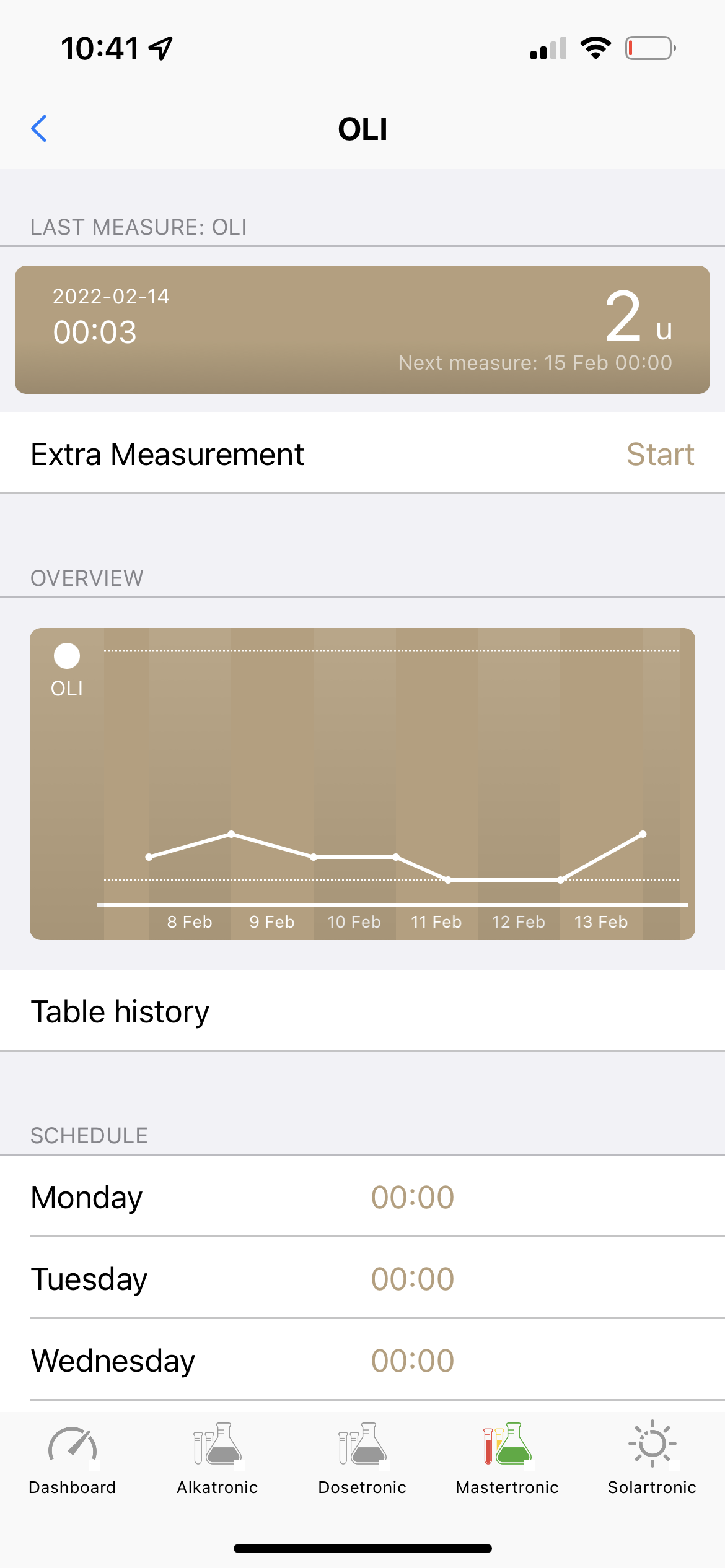 The AIO app's dashboard displays the latest test data from Mastertronic, Alkatronic, and even the Solartronic lighting schedule. A simple and intuitive overview of the system's current status.