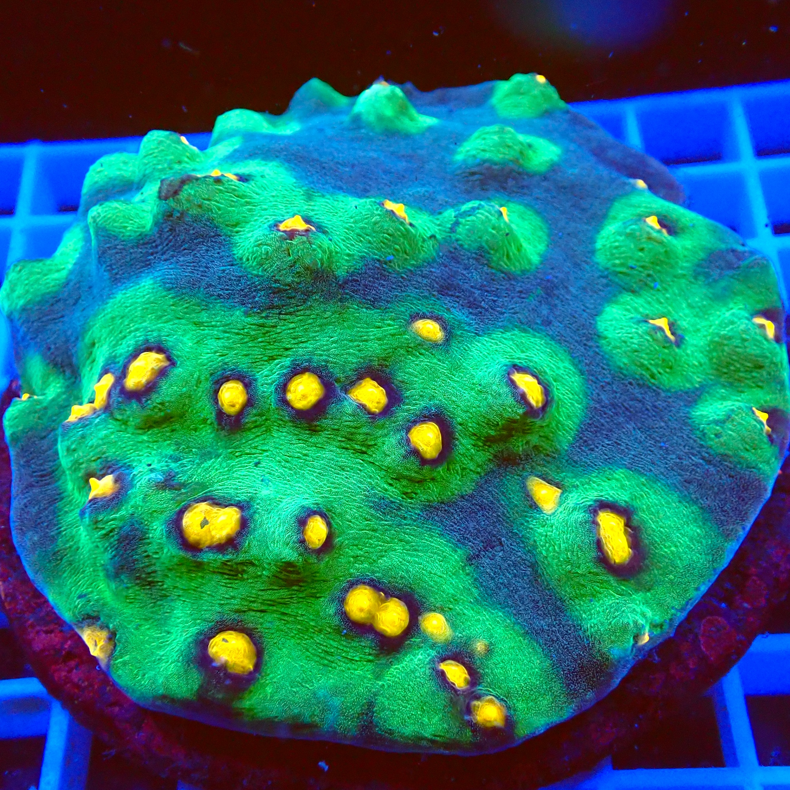WYSIWYG1754993657079 Unique WYSIWYG Yellow Submarine Favia coral. One-of-a-kind, exactly what you see! Looking for a real eye-catcher for your reef tank? This unique WYSIWYG coral is an absolute must-have for every serious reefkeeper. No stock photos or surprises – what you see is exactly what you get. And what you get is spectacular.