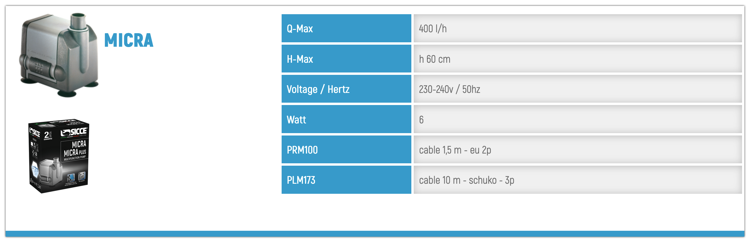 SICCE-PRM220 The Sicce Micra Plus is a compact, reliable universal pump with a capacity of 600 liters per hour and a maximum delivery head of 85 cm. Thanks to its quiet and energy-efficient design, this pump is...