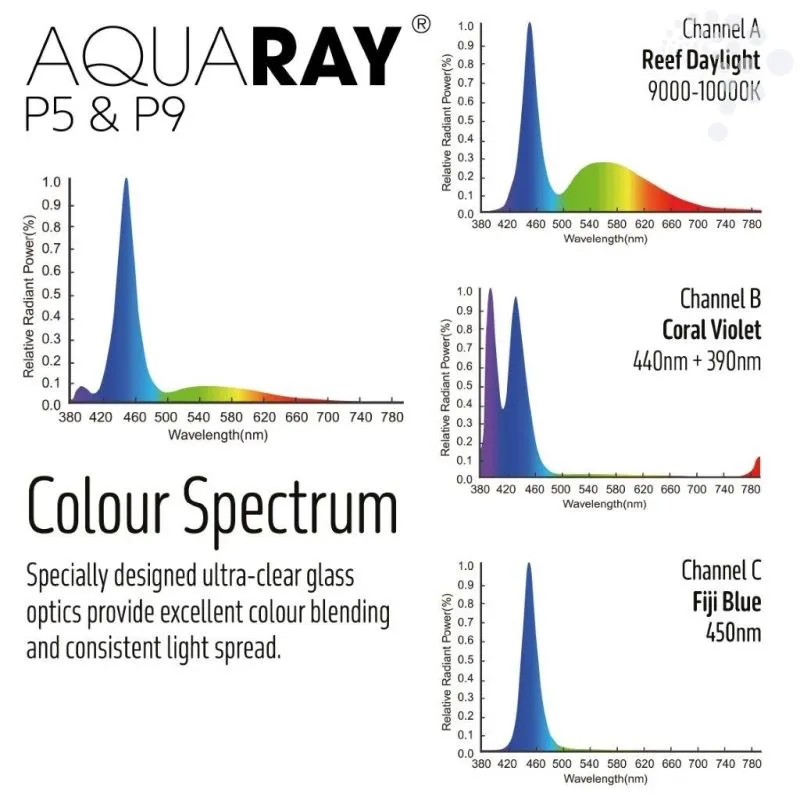 The TMC AquaRay P9 Connect is a premium LED lighting solution for reef aquariums, designed for maximum performance, deep penetration, and complete control. With impressive light output, advanced lens optics, and the wireless Connect platform, the P9 Connect offers hobbyists the perfect blend of power, flexibility, and style.