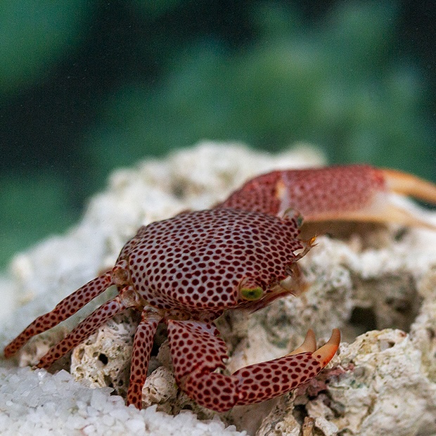 This symbiotic crab is an excellent addition to a reef aquarium with live corals. It lives harmoniously within colonies of branching corals and can contribute to coral health by keeping the surface clean of detritus and small parasites.