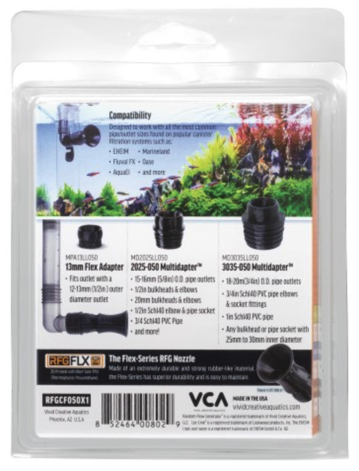 VCA-RFGS150-FLEX The VCA 1.5in RFGS Nozzle with Multidapter for 1.5-inch PVC tubing is the innovative solution for optimizing flow in your marine aquarium. This high-quality nozzle from Vivid Creative Aquatics...