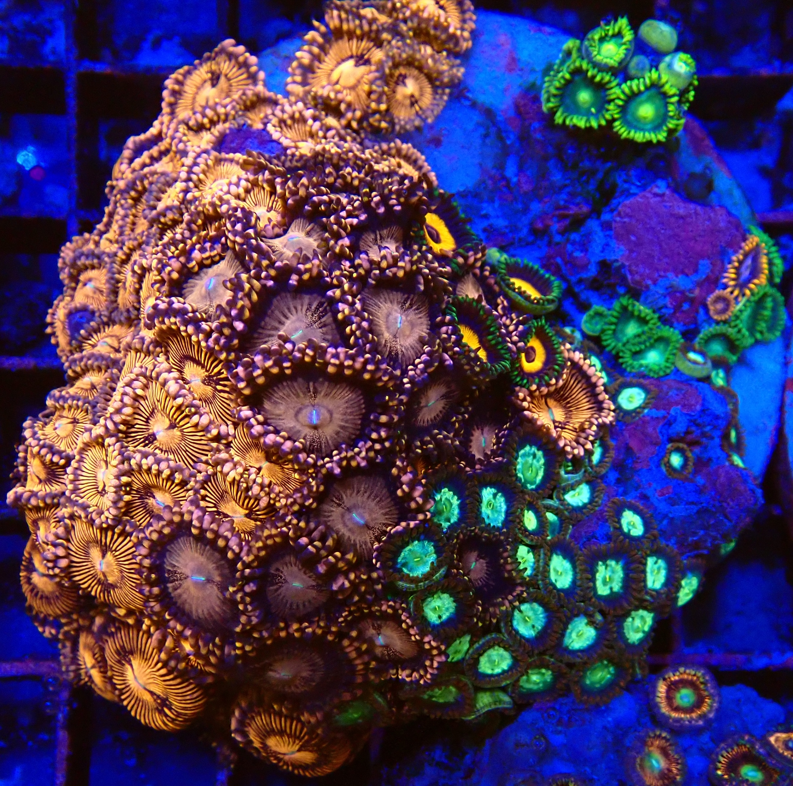 Unique WYSIWYG Zoanthus garden coral. One-of-a-kind, exactly what you see! Are you looking for a real eye-catcher for your reef aquarium? This unique WYSIWYG coral is an absolute must-have for every serious reefkeeper. No stock photos or surprises – what you see is exactly what you get. And what you get is spectacular.
