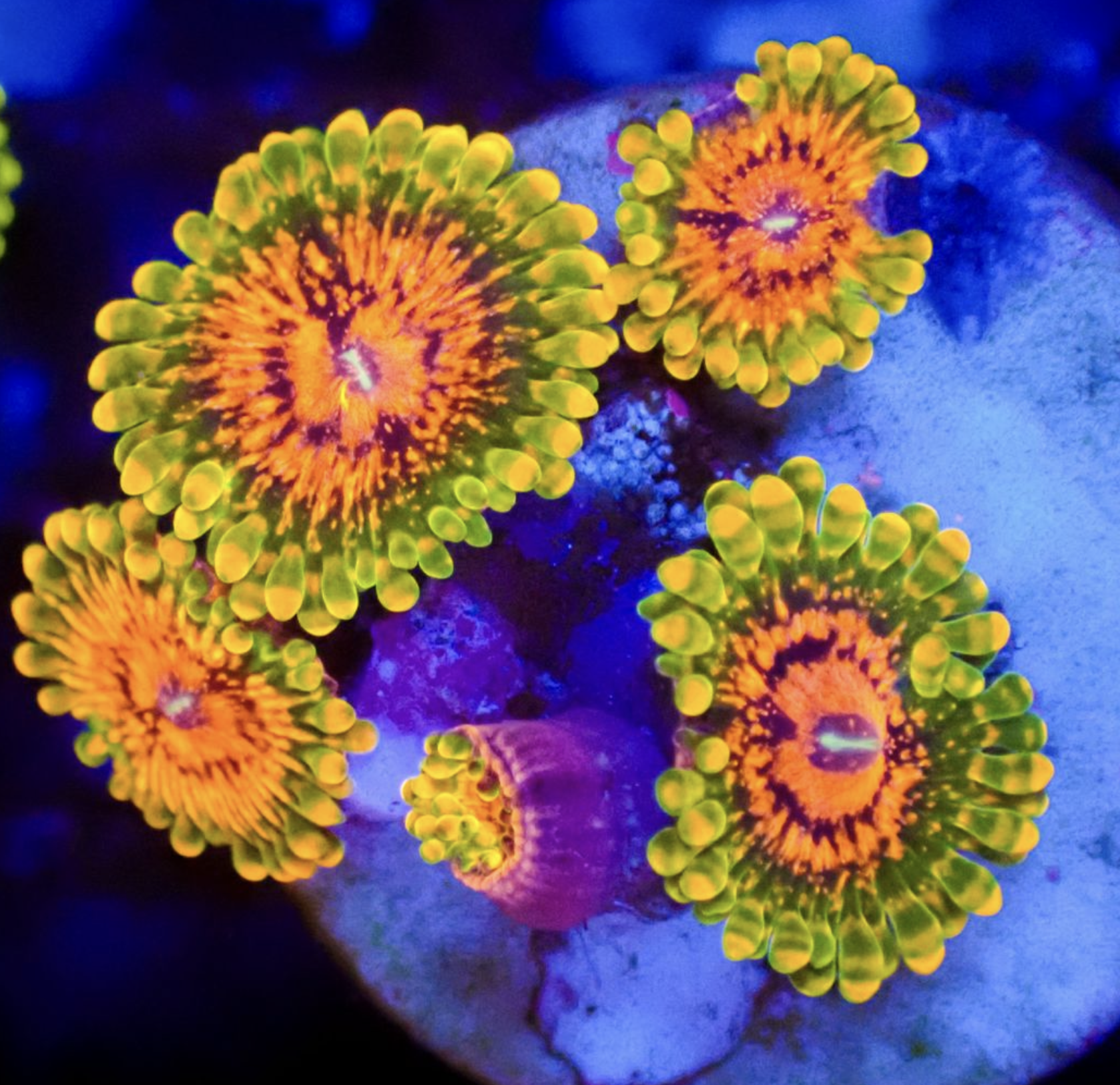 Zoanthus Grand master Krakatoa are bizarrely colorful polyps, the brightest, rarest zoanthus in the world.