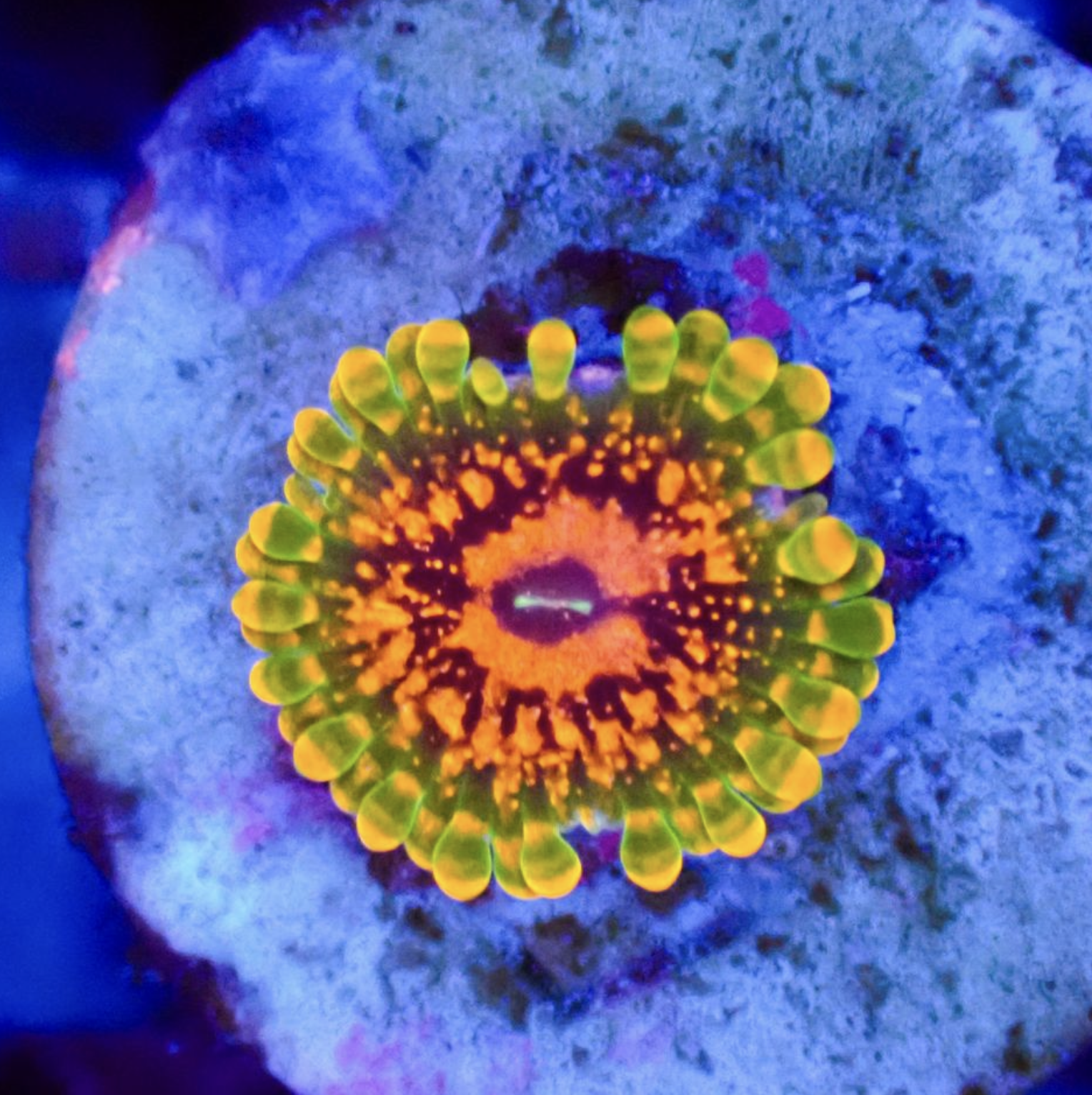 106099939 Zoanthus Nirvana are bizarrely colorful polyps, bright, fluorescent yellow/green/orange in color. Real multi-coloured zoanthus.