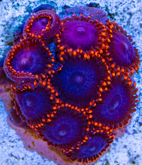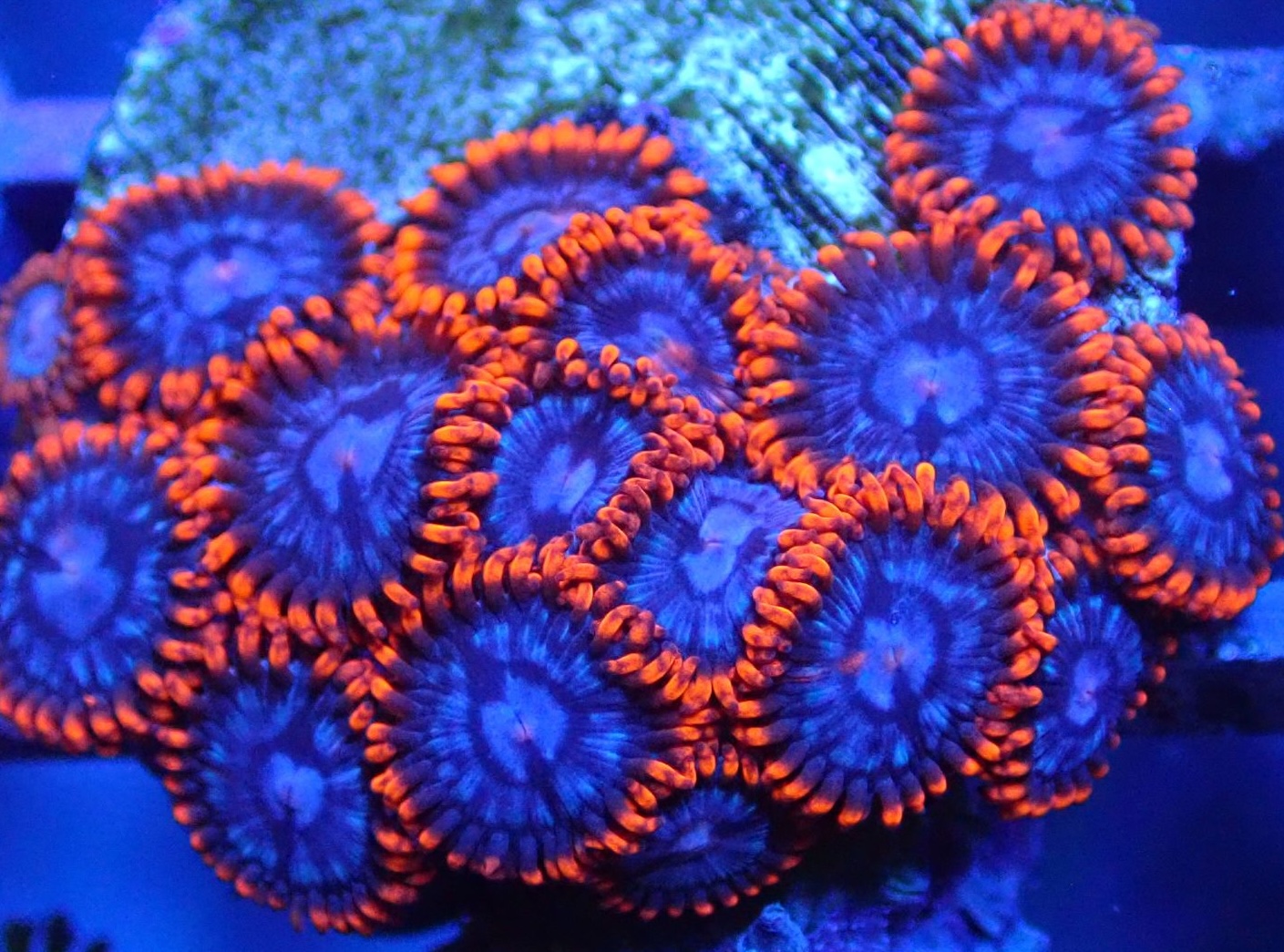 103896281 Zoanthus Lunar Eclipse are bizarrely colorful polyps, bright, fluorescent red/blue in color with a bright lighter blue core. Easy to hold and very suitable for beginners. Characteristics...